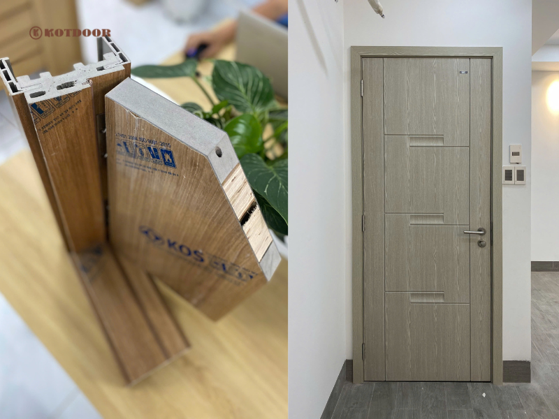 - Lớp nhựa PVC là lớp nhựa dẻo mềm, được sử dụng công nghệ mới ép cách nhiệt trên bề mặt cửa không lo bị bóng tróc.