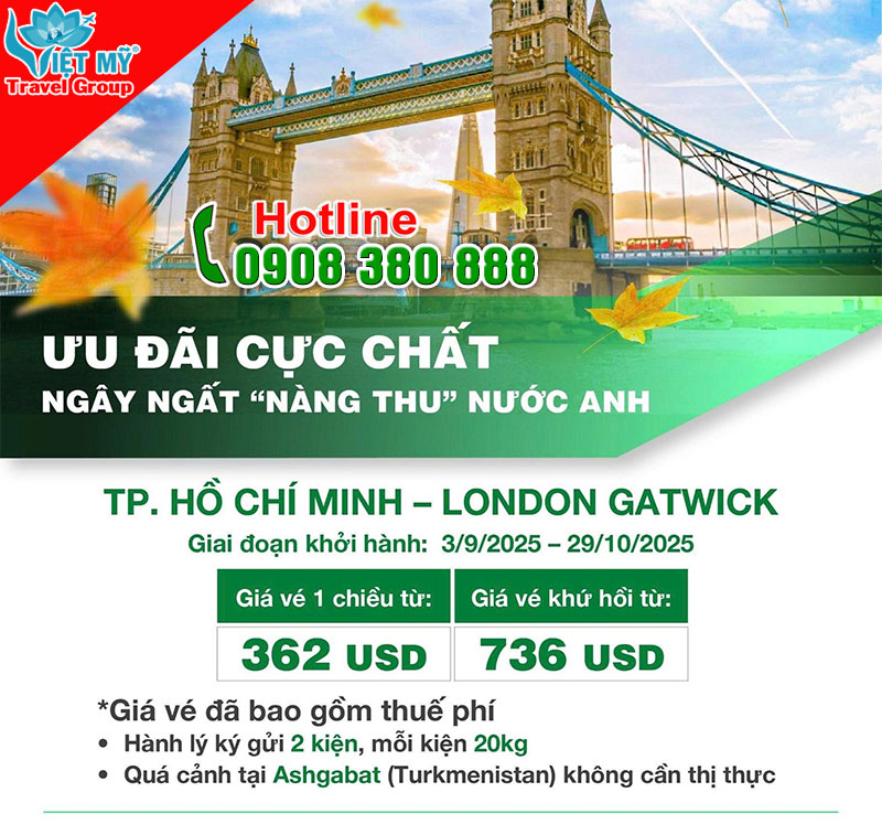 Bay cùng Turkmenistan Airlines với vé siêu ưu đãi – Mùa thu chính là thời điểm lý tưởng để bạn bắt đầu hành trình khám phá xứ sở sương mù với thời tiết se lạnh và màu vàng lá rụng. Hãng hàng không Turkmenistan Airlines mang đến cơ hội bay thẳng tới thủ đô nước Anh với mức giá ưu đãi chỉ từ 362 USD/chiều và 736 USD/khứ hồi. Với giá vé siêu hời và nhiều quyền lợi hấp dẫn, đây chính là cơ hội tuyệt vời để bạn tận hưởng trọn vẹn mùa thu London, thành phố vừa cổ kính, vừa hiện đại. Nhanh tay liên hệ ngay cho Vệt Mỹ để mua vé ngay hôm nay bạn nhé.