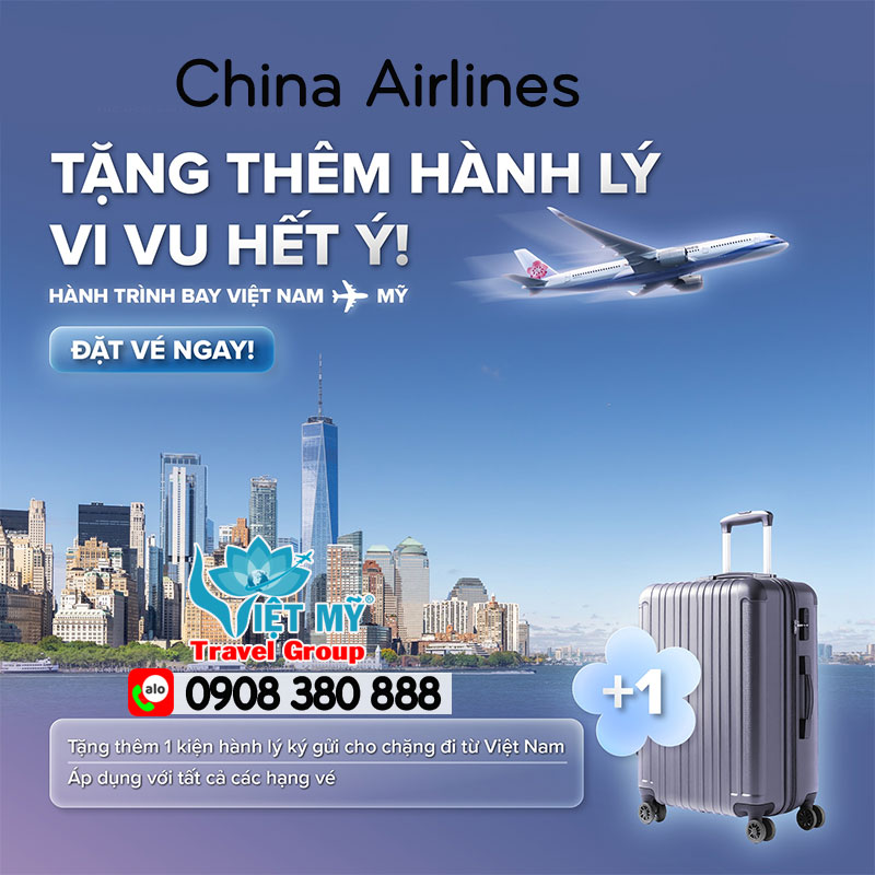 Đừng bỏ lỡ cơ hội bay Mỹ với ưu đãi tặng thêm hành lý ký gửi từ China Airlines. Nhanh tay liên hệ: