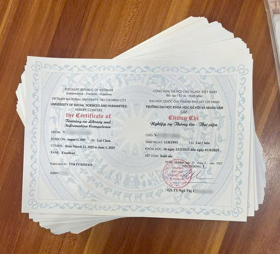 Chứng chỉ Thông tin – Thư viện do Trường Đại học Khoa học Xã hội và Nhân văn – ĐHQG TP.HCM cấp. Đây là một trong những trường đại học uy tín hàng đầu về lĩnh vực khoa học xã hội tại Việt Nam. Chứng chỉ có giá trị pháp lý toàn quốc, được nhiều cơ quan nhà nước, trường học, trung tâm văn hóa công nhận.
