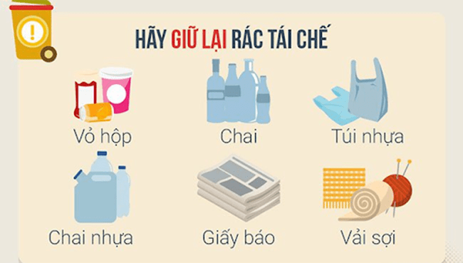 Rác tái chế là những vật liệu có thể xử lý và tái sử dụng thay vì bị chôn lấp hoặc đốt bỏ. Các loại rác phổ biến có thể tái chế gồm: