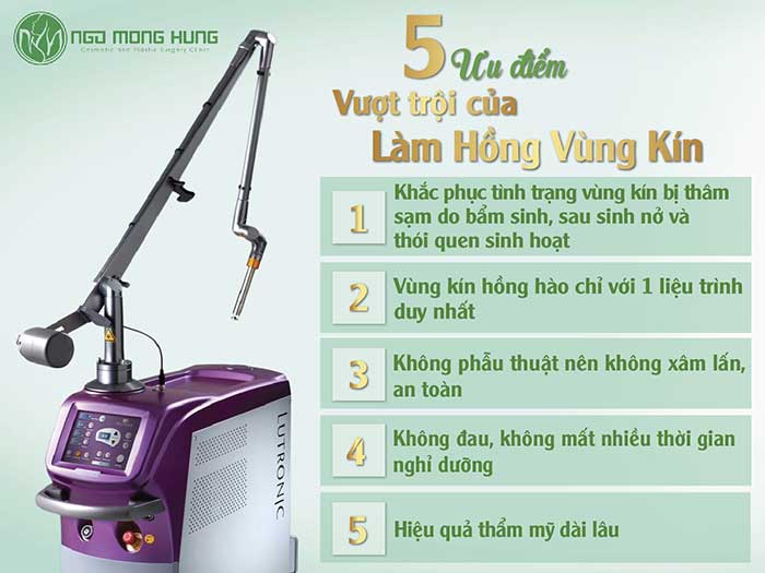 Làm hồng vùng kín bằng công nghệ Laser Petit Lady Action II hiện đang được áp dụng rất thành công tại bệnh viện thẩm mỹ Ngô Mộng Hùng. Vì vậy nếu các chị em mong muốn được tiến hành tẩy trắng vùng bikini, thì có thể đến đây để tiến hành dich vụ.